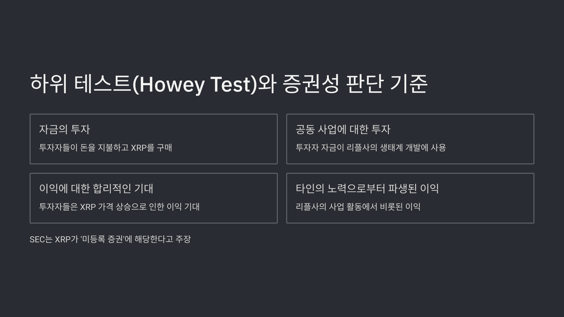 - 타인의 노력으로부터 파생된 이익 (To be derived from the entrepreneurial or managerial efforts of others): 그 이익이 전적으로 리플사의 사업 활동, 기술 개발, 파트너십 체결 등에서 비롯된다고 보았다.