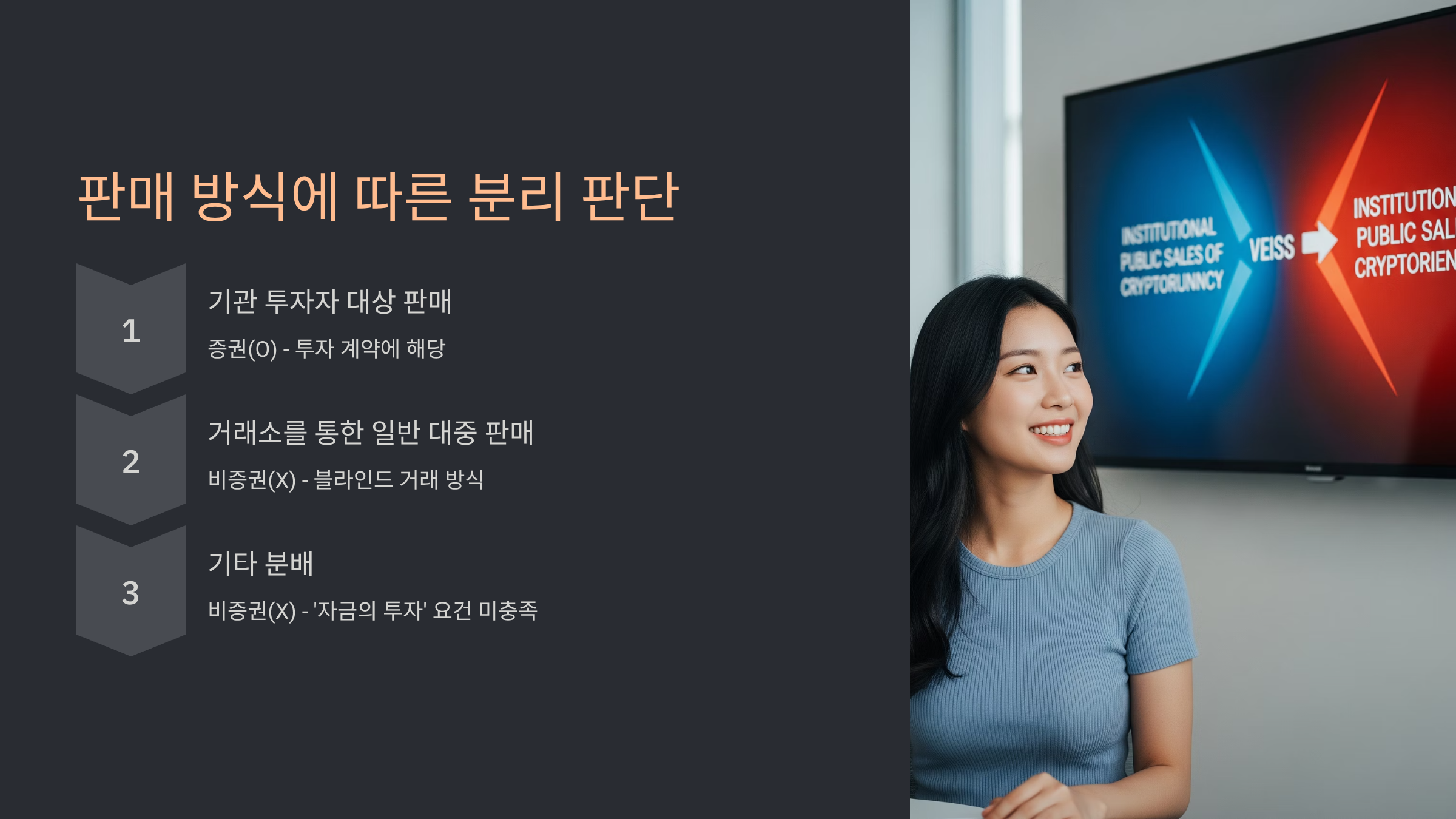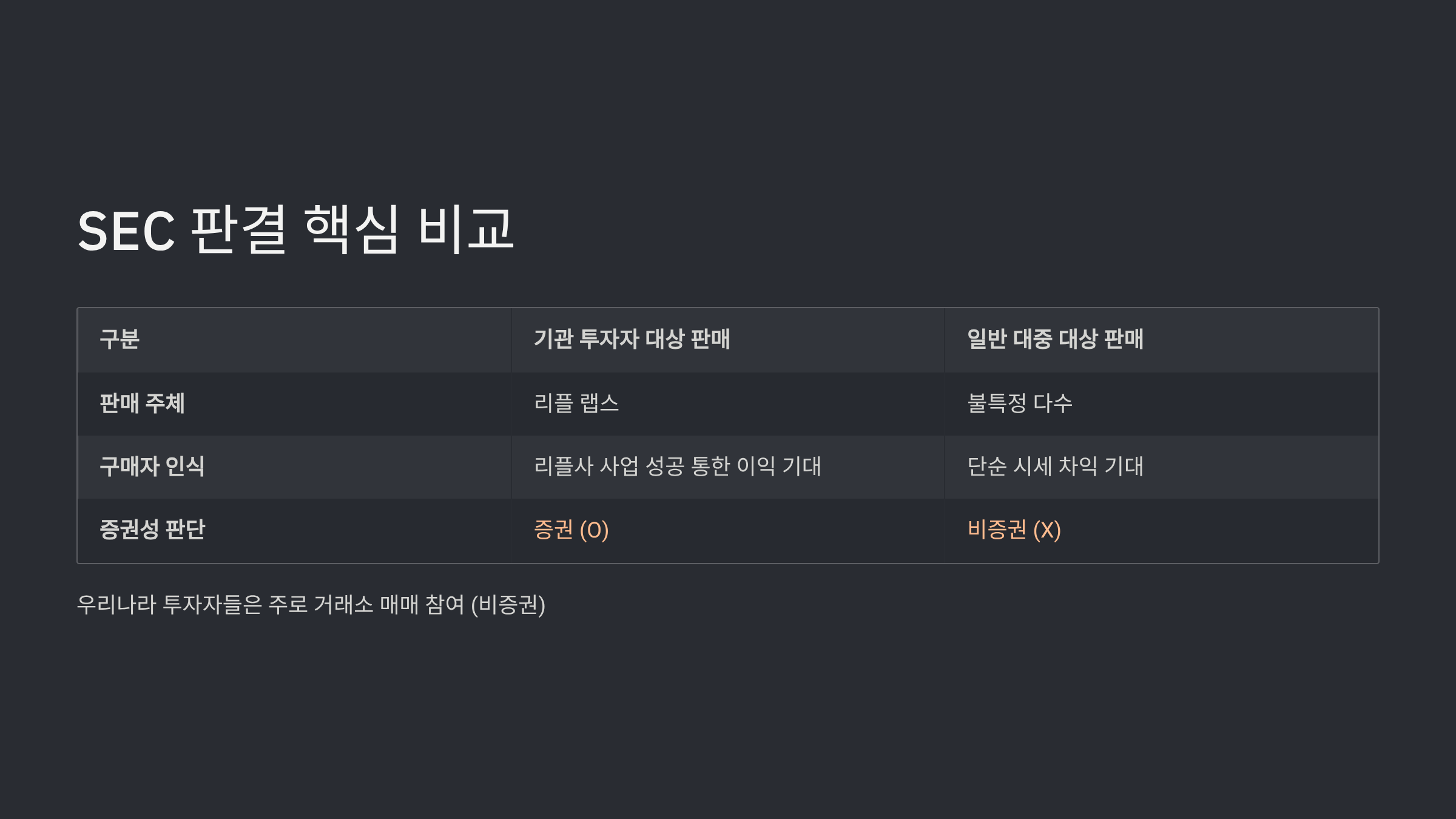이번 판결의 핵심은 판매 대상과 방식에 따라 XRP의 법적 성격을 다르게 보았다는 점입니다. 이 복잡한 내용을 투자자들이 쉽게 이해할 수 있도록 아래 표로 정리했습니다. 특히 우리나라 투자자들이 주로 참여하는 거래소 매매가 왜 증권으로 분류되지 않았는지 명확히 파악할 수 있습니다.
