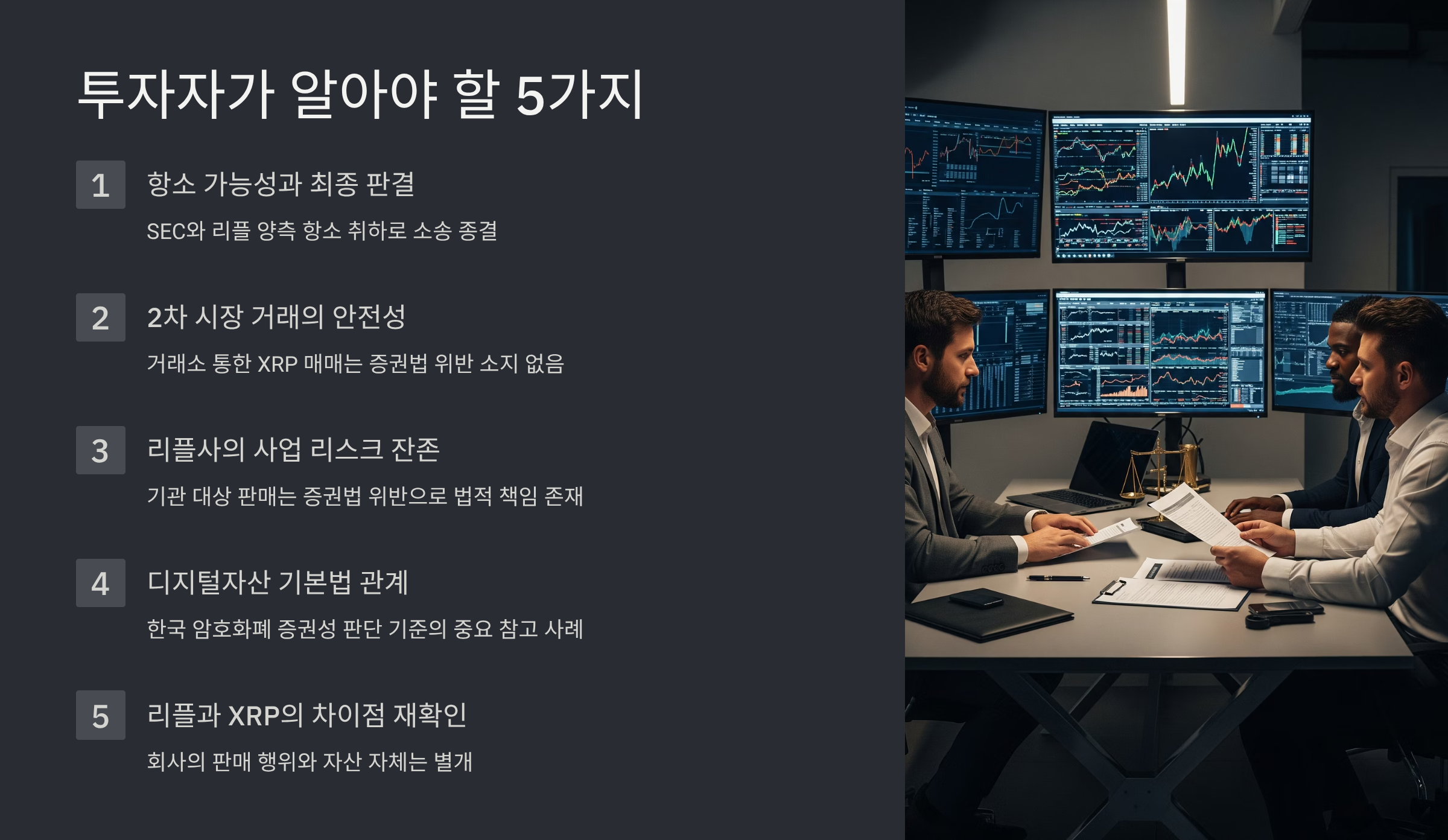 이번 판결은 XRP를 둘러싼 가장 큰 규제 리스크를 해소하며 시장에 긍정적인 신호를 주었습니다. 하지만 이것이 모든 문제의 해결을 의미하는 것은 아닙니다. 우리나라 투자자들은 다음 5가지 사항을 명확히 인지하고 신중한 투자 전략을 세워야 합니다.