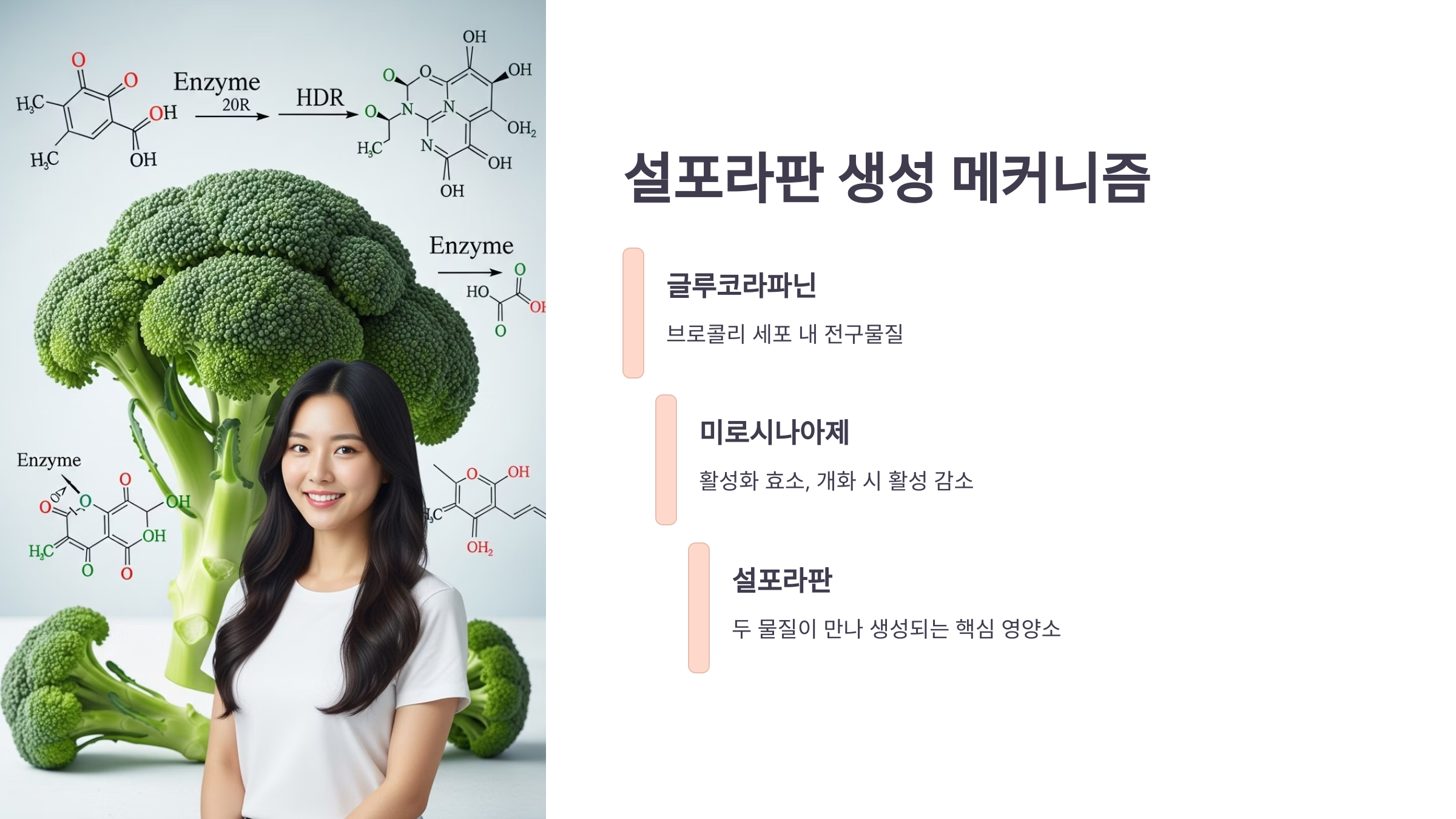 브로콜리의 핵심 영양 성분인 설포라판(Sulforaphane)은 처음부터 그 형태로 존재하는 것이 아닙니다. 브로콜리 세포 안에는 전구물질인 '글루코라파닌(Glucoraphanin)'과 이를 활성화하는 '미로시나아제(Myrosinase)'라는 효소가 서로 분리된 공간에 저장되어 있습니다. 우리가 브로콜리를 씹거나 자를 때 세포벽이 파괴되면서 비로소 이 두 물질이 만나 설포라판이 생성됩니다.