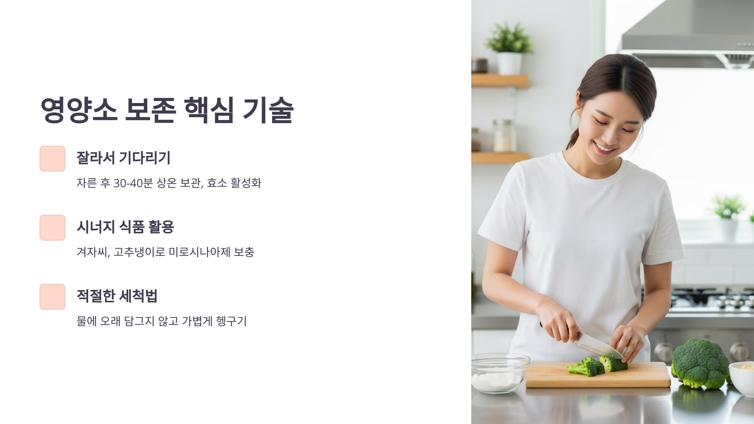 영양소 파괴는 조리 과정뿐만 아니라 세척과 손질 단계에서도 시작됩니다. 특히 브로콜리 꽃처럼 조직이 연약해진 상태에서는 더욱 세심한 주의가 필요합니다. 다음은 유효성분을 지키는 전문가의 세척 및 손질 노하우입니다.