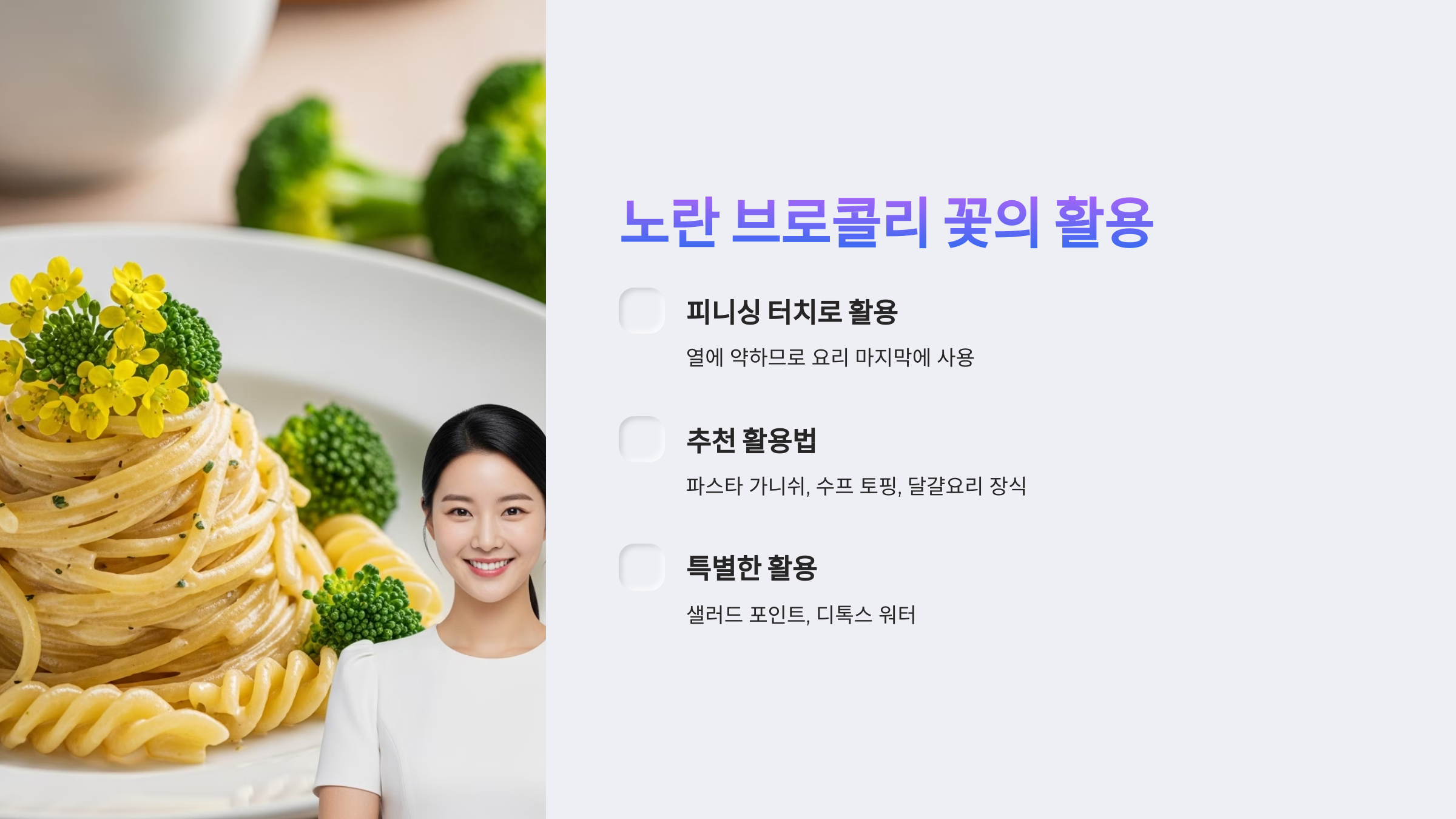 - 오일 파스타 가니쉬: 알리오 올리오처럼 조리가 끝난 오일 파스타 위에 브로콜리 꽃을 흩뿌려주면, 잔열에 살짝 숨이 죽으며 특유의 풍미가 오일에 녹아들어 맛의 깊이를 더합니다.