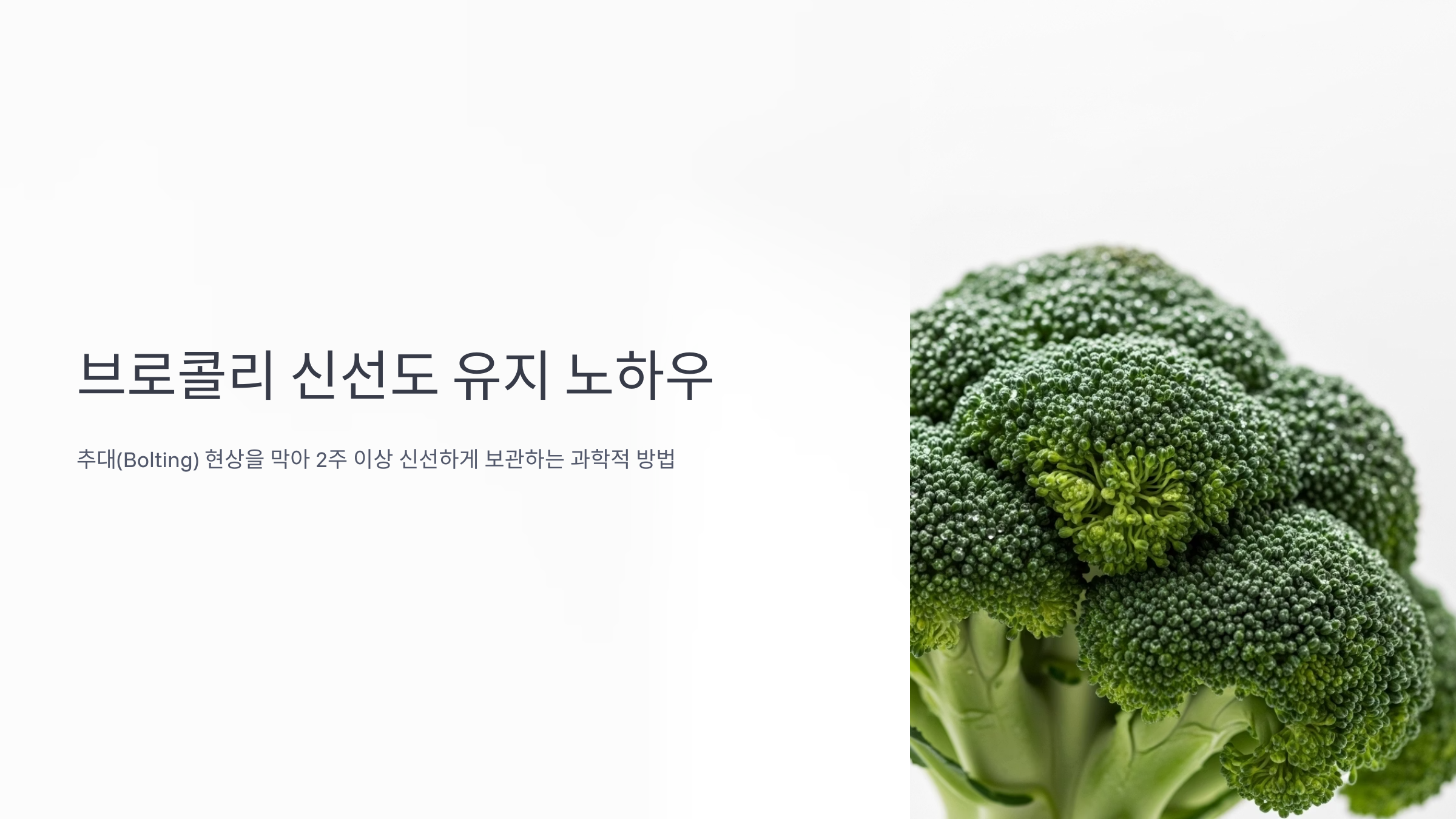 브로콜리 꽃 피움(추대)을 막는 최적의 보관 온도와 환경 조건 노하우에 대해 알려드립니다. 애써 고른 신선한 브로콜리가 며칠 만에 노랗게 변하며 꽃대가 올라오는 것을 보면 속상하기 마련입니다. 이는 단순히 신선도가 떨어지는 것을 넘어, 맛과 영양, 식감까지 저하시키는 '추대(Bolting)' 현상 때문입니다. 이 글은 브로콜리의 생리학적 특성을 기반으로, 구매 순간부터 냉장고 속까지 추대를 과학적으로 억제하고 최상의 상태를 2주 이상 유지하는 전문가의 실용적인 노하우를 단계별로 제시합니다.