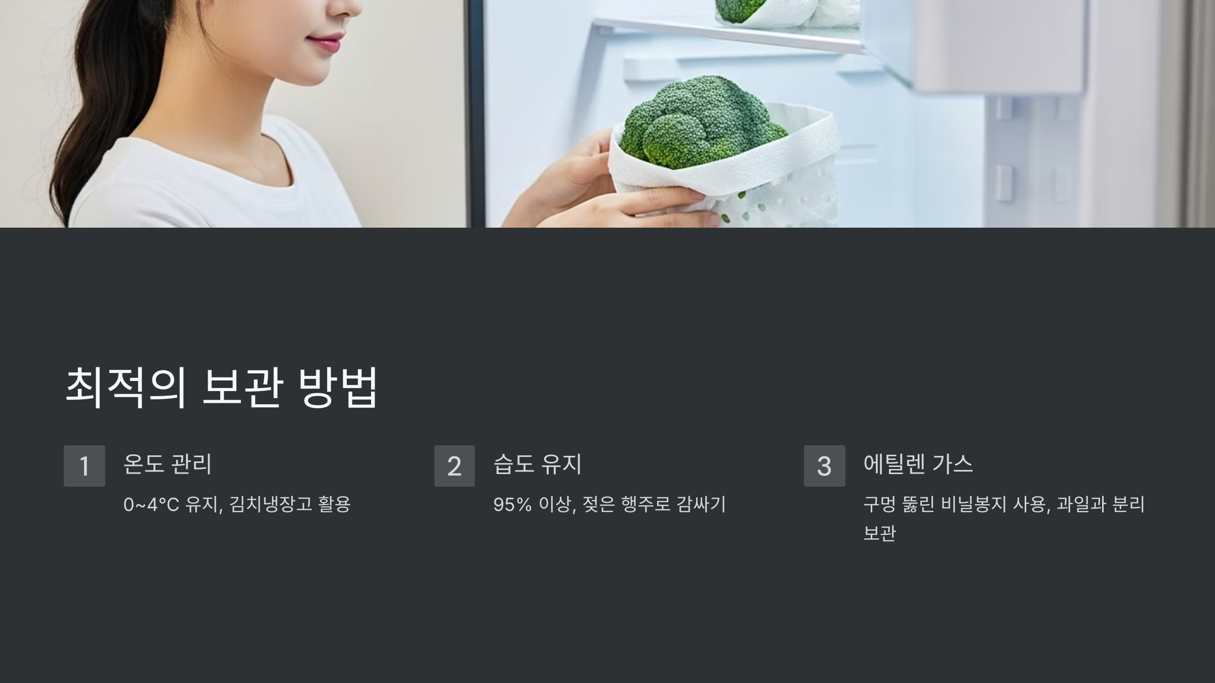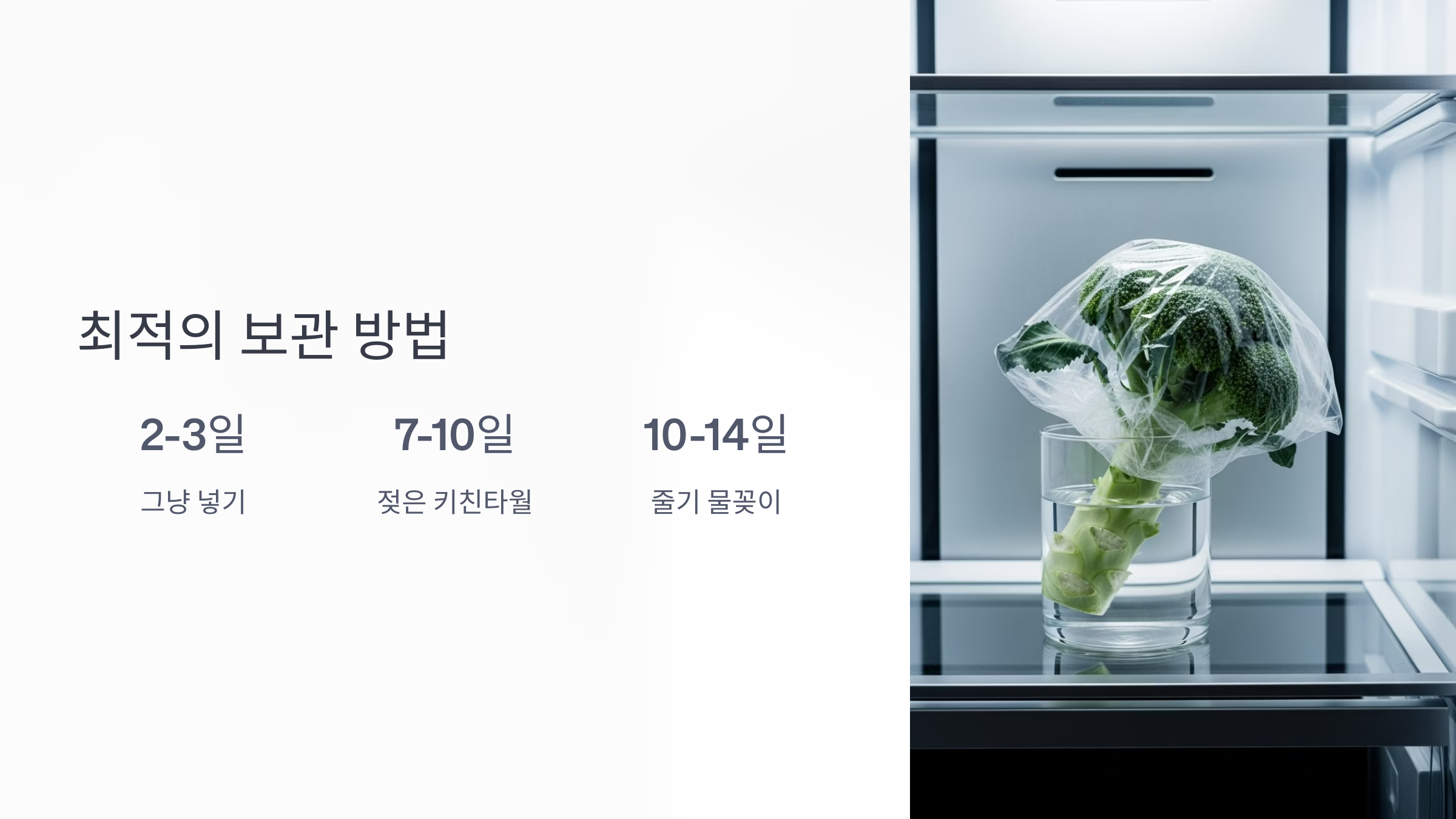 | 그냥 넣기 | 2~3일 | 편리함 | 급격한 수분 손실, 브로콜리 꽃 피움 가속화 | 비추천 |