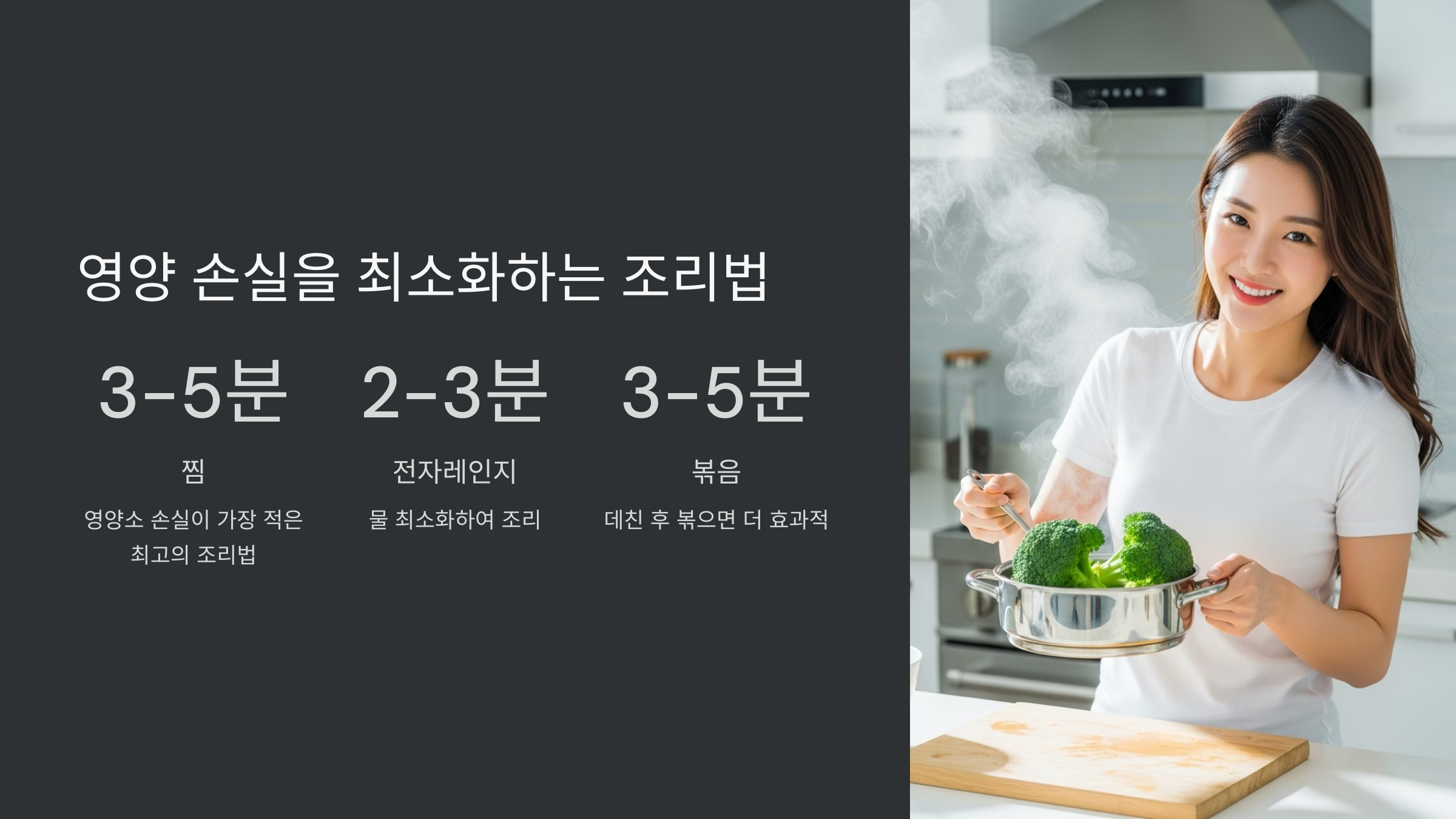 | 찜 (Steaming) | 3~5분 | 매우 높음 | 최적 | 영양소 손실이 가장 적은 최고의 조리법 |