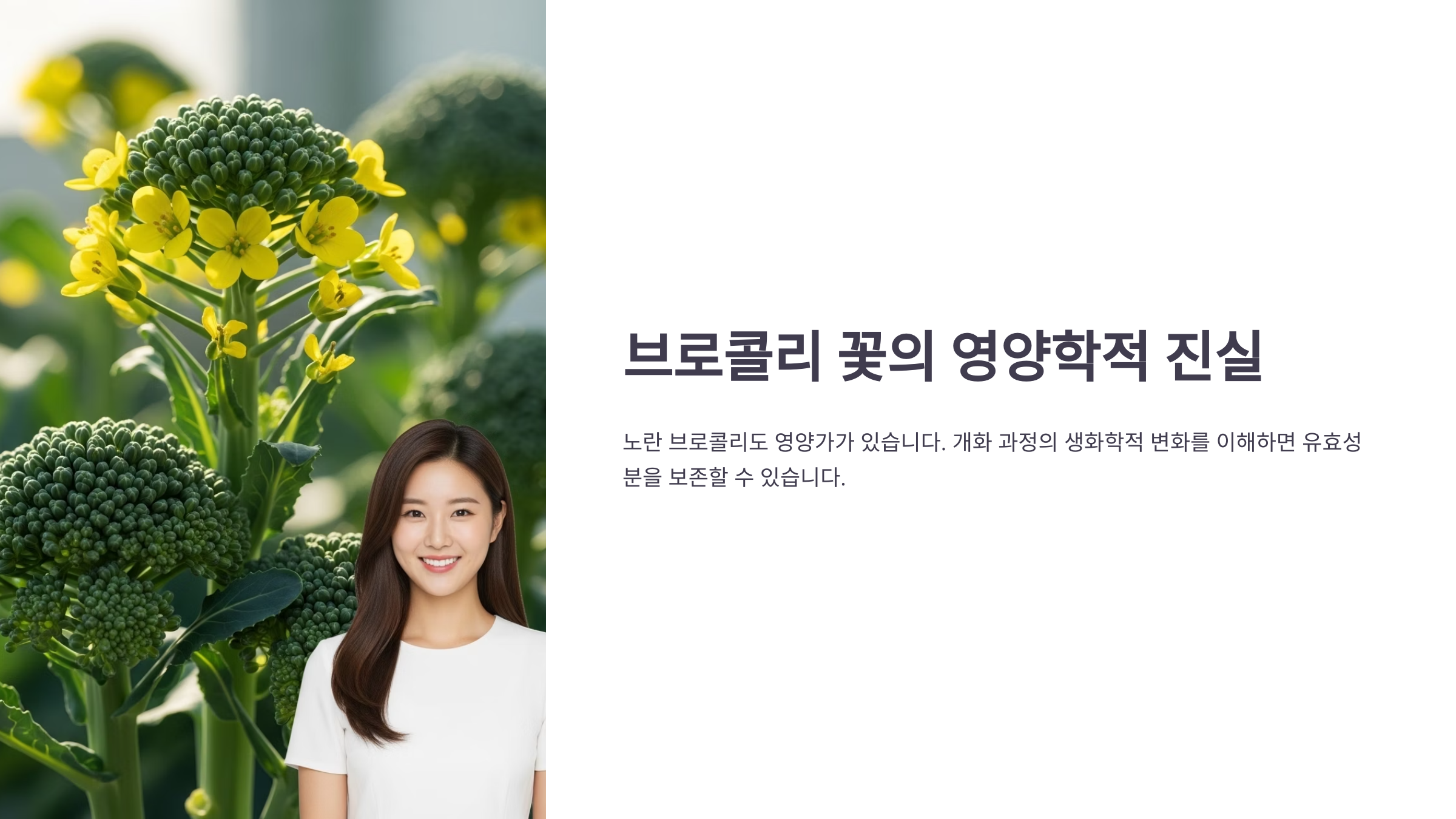 브로콜리 꽃, 개화 단계별 영양성분 변화와 유효성분 보존의 진실에 대해 깊이 있게 탐구해 보겠습니다. 많은 분들이 노랗게 변한 브로콜리를 보며 영양이 모두 사라졌을 거라 생각하지만, 사실은 개화 단계에 따른 생화학적 변화를 이해하고 올바르게 대처하면 그 유효성분을 충분히 보존하며 섭취할 수 있습니다. 이 글은 브로콜리의 핵심 성분인 설포라판을 중심으로, 개화 과정에서 일어나는 변화와 그 영양을 지키는 과학적인 방법을 전문가의 시각으로 제시합니다.
