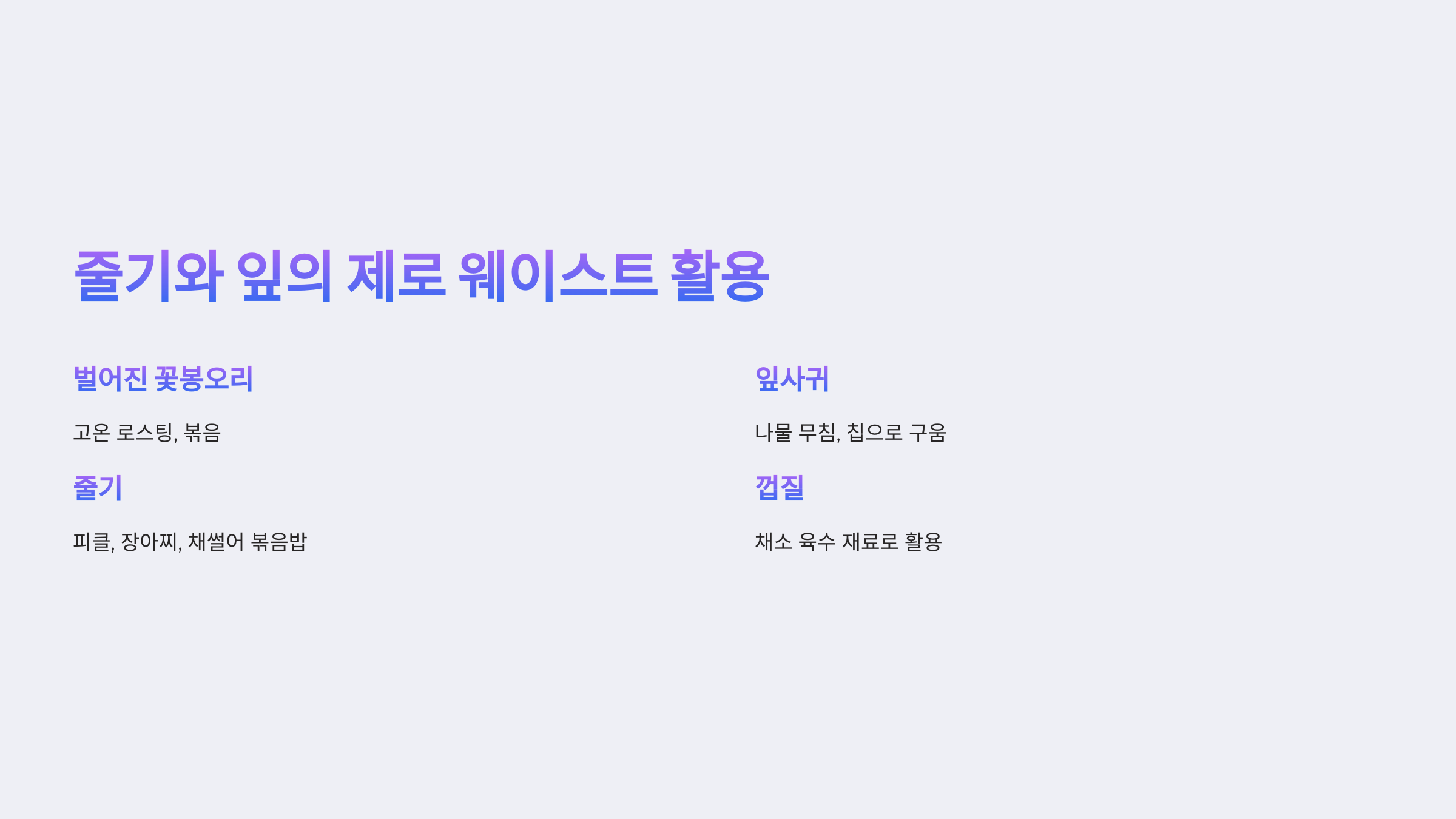 | 줄기 겉껍질 | 감자칼로 벗겨낸 질긴 껍질 | 채소 육수 (채수) | 버리지 말고 양파껍질, 당근 꽁지 등과 함께 끓여 채수를 만들면 요리의 깊은 맛을 더함. |
