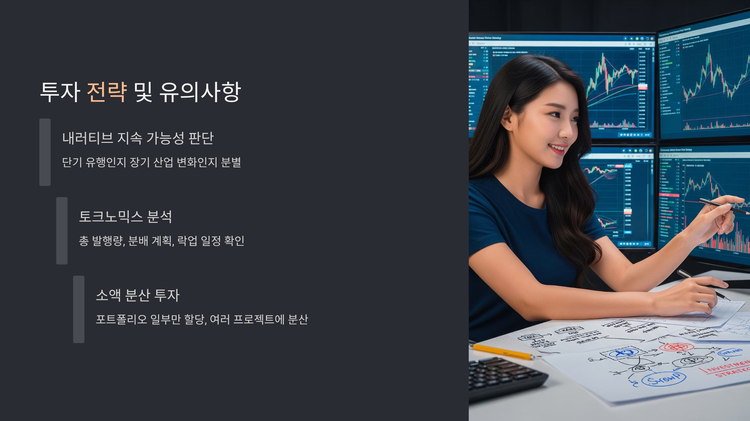 첫째, '내러티브'의 지속 가능성을 판단해야 합니다. 현재 시장의 주목을 받는 테마가 단기적인 유행에 그칠지, 아니면 장기적인 산업의 변화를 이끌어낼지를 분별하는 안목이 중요합니다. 프로젝트가 해결하고자 하는 문제가 명확하고, 실제 수요가 존재하는지를 따져봐야 합니다.