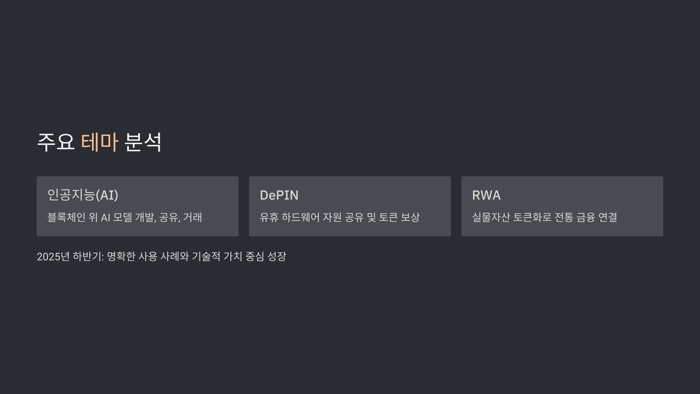 2025년 하반기 암호화폐 시장은 단순히 유동성에 의존하는 것을 넘어, 명확한 사용 사례와 기술적 가치를 지닌 프로젝트들이 두각을 나타낼 것으로 보입니다. 특히 인공지능(AI), DePIN, RWA는 블록체인 기술이 현실 세계와 접목되어 실질적인 가치를 창출하는 핵심 분야로, 향후 코인 시세 전망을 긍정적으로 이끌 유력한 테마입니다.