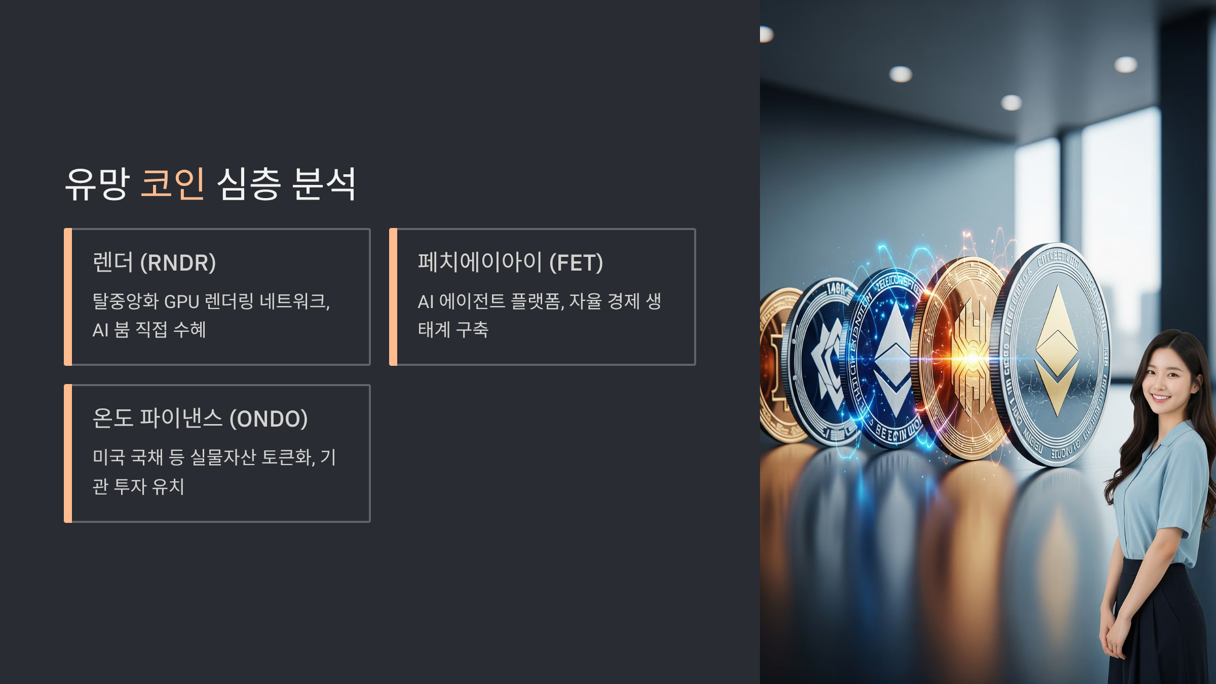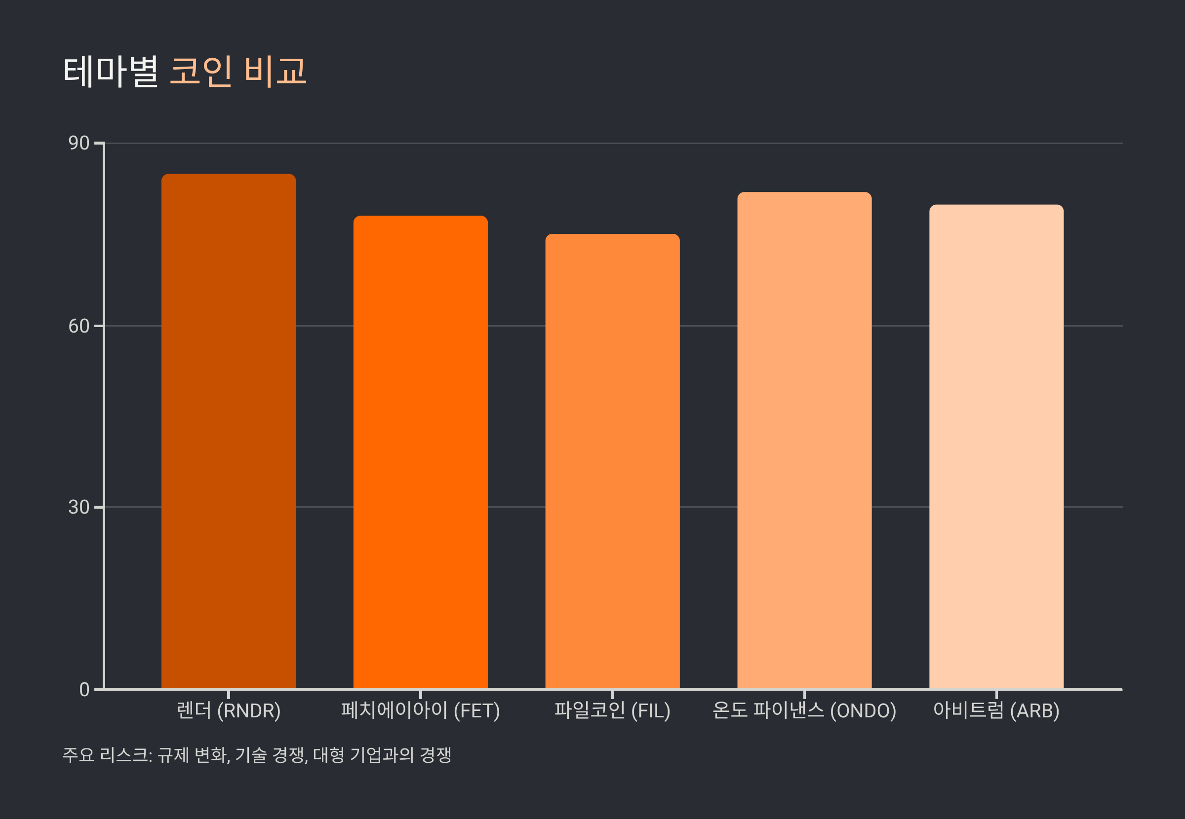 | 렌더 (RNDR) | AI, DePIN | 탈중앙화 GPU 렌더링 네트워크 | AI 붐에 따른 GPU 수요 증가의 직접적 수혜 | 대형 클라우드 기업과의 경쟁 심화 |
